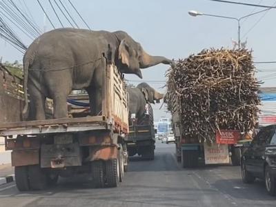 泰国那空沙旺府两只正由货车运送的大象趁红灯等候时偷吃旁边货车上的甘蔗视频:泰国...