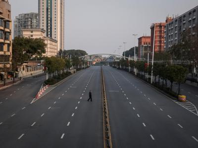 2020年2月3日,一名男子穿越中国武汉一处空荡荡的高速公路。 中国武汉冠状病毒感染...