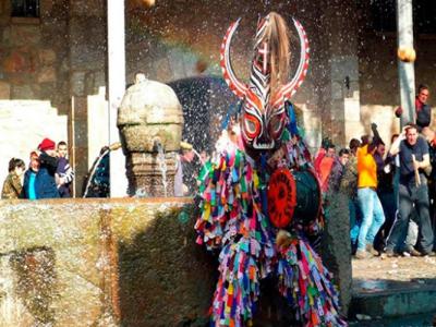 西班牙首都马德里以西埃斯特雷马度拉地区小镇古老节庆 戴面具男子被掷蔬菜(神秘的...