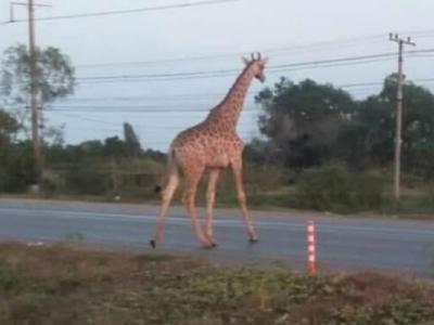 泰国北柳府从动物园货车“逃跑”的长颈鹿