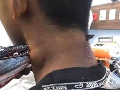 印尼16岁少年捕鱼时被跳上船的颌针鱼刺穿
