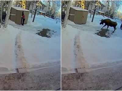 美国阿拉斯加州胆小男子倒垃圾遇麋鹿躲进
