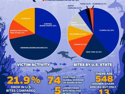 2022年鲨鱼咬伤的地图和汇总统计数据。Credit: Jane Dominguez/University of Flor...