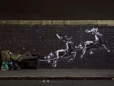 英国神秘涂鸦大师Banksy圣诞新作 驯鹿带露宿者飞天(神秘的地球uux.cn报道)据东网...