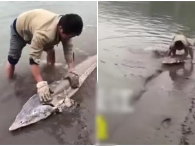 重庆江津区钓鱼发烧友李金泉在长江钓到一条长2.18米有“水中大熊猫”之称的达氏鳇(...