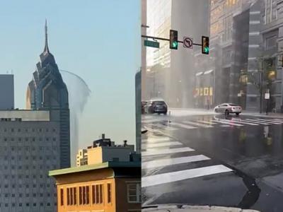 美国费城摩天大厦One Liberty Place喷出水柱 附近街道出现“天降大雨”景象(神秘的...