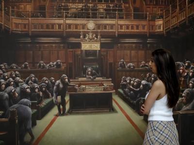 英国街头涂鸦艺术家Banksy10年前绘画的《黑猩猩下议院》以破纪录的990万英镑高价拍...