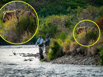美国阿拉斯加卡特迈国家公园和自然保护区捕鱼者背后出现一只巨熊(神秘的地球uux.c...