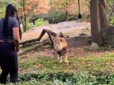 美国非裔女子爬进动物园“狮子园区”挑衅万兽之王雄狮视频:美国非裔女子爬进动物园...