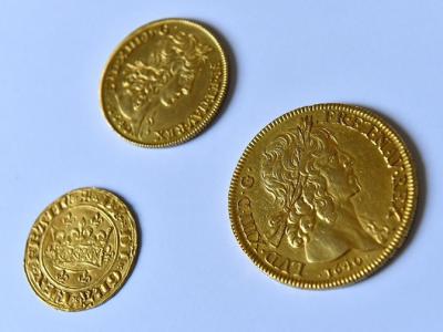 波尔多的拍卖行即将拍卖菲利普四世(左)和路易十三的金币(中、右)。金币上刻有路...