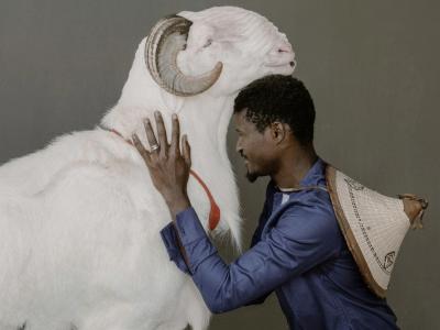 管理一群拉多姆绵羊的阿萨内.迪耶(Assane Dieye),正在炫耀一头名叫巴伦迪欧(Ba...