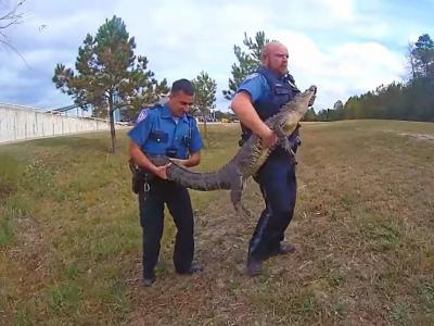 美国德州拉夫金市鳄鱼误闯私人地方 遭警察抱走霸气尽失(神秘的地球uux.cn)据东网...
