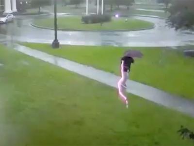 美国南卡罗莱纳州学校辅导员风暴中撑伞离校回家 险被闪电直接击中视频:美国南卡罗...