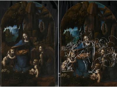 《岩间圣母》(左图)下的草图(右图白线)获披露。草图相当完整。(神秘的地球uux...