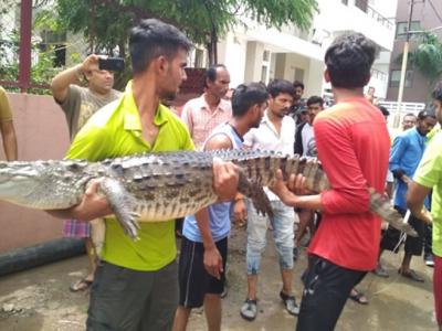 瓦多达拉居民合力捉走鳄鱼。鳄鱼潜伏水中,再慢慢逼近狗只。(神秘的地球uux.cn报道...