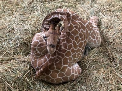 日本高知县香南市立野市动物园长颈鹿宝宝卷颈甜睡 背脊当枕头(神秘的地球uux.cn报...