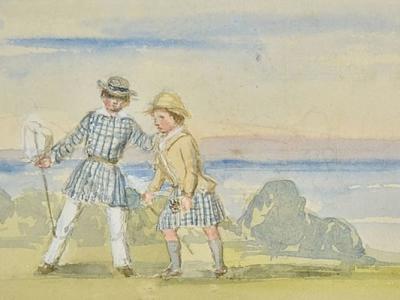 画中人是维多利亚女王的两个儿子在玩乐。威廉二世手持玩具的婴儿画像(左图);女王...