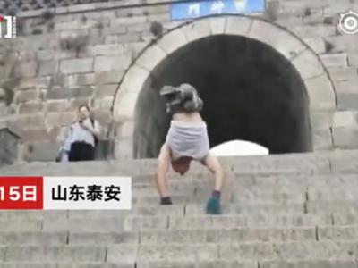山西临汾的刘红刚天生双腿残疾 双手支撑倒立用时11个小时成功登顶泰山虽然有人投来...