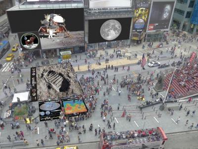纽约时代广场多个大型屏幕播放登月短片。博物馆在华盛顿纪念碑投影高达110米的土星...