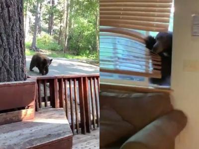 美国塔霍湖附近大黑熊试图闯入度假屋吓坏
