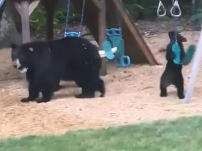 美国康涅狄格州熊妈妈带着2只熊宝宝闯入庭院玩秋千单杆视频:美国康涅狄格州熊妈妈...