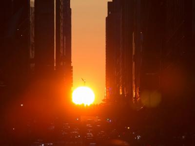 “曼哈顿悬日”!美国纽约曼哈顿傍晚出现