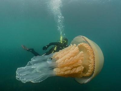 英国南部康沃尔郡海岸拍到一只和人一样大的巨型水母(神秘的地球uux.cn报道)潜水员...