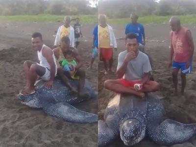 印尼濒危棱皮龟上岸产蛋 惨遭民众轮流骑