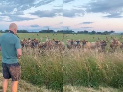 美国俄勒冈州男子在田间吹奏乐器 远处牛群竟闻“风”而至视频:美国俄勒冈州男子在...
