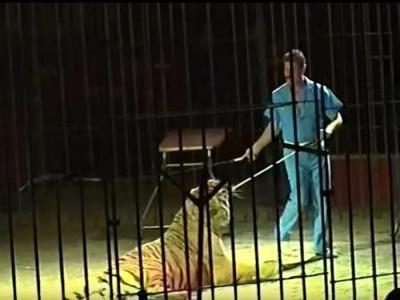 意大利马戏团驯兽师训练时被老虎们“玩弄