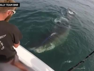 美国新泽西州钓鱼比赛后归来的运动员差点捕获一条大白鲨视频:美国新泽西州钓鱼比赛...