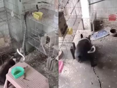 巨蛇钻进鸟笼想吃鹦鹉 鸟店小狗立刻冲上