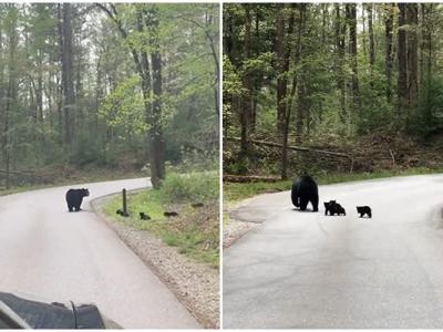 美国大烟山国家公园黑熊妈妈过马路 后面跟着4个“黑碳”(神秘...