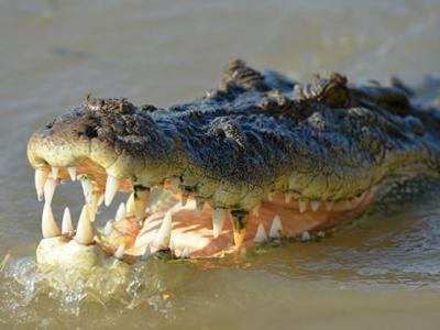 印度尼西亚苏拉威西岛食人鳄鱼口含人类尸体