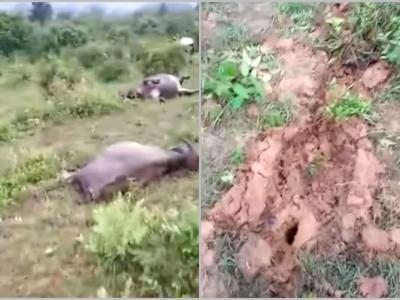 多只被雷劈死的水牛伏尸草地(左图);现场泥地有明显遭雷击痕...
