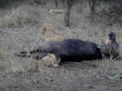 南非克留格尔国家公园一只幼狮将头塞进水牛肛门里卡住动弹不得(神秘的地球uux.cn)...
