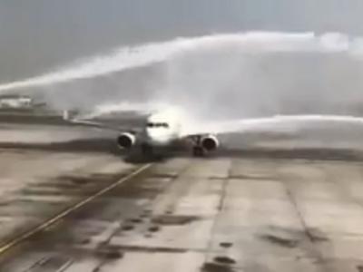 空中巴士A320-214班机降落迪拜机场接受“水炮礼”欢迎 意外被...