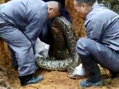 广东佛山村庄惊现35公斤重巨蟒 3名壮汉合
