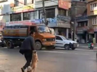 美国记者在尼泊尔首都加德满都拍到主人“手牵手”拖着小狗过马...