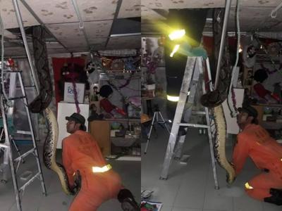 泰国曼谷邦那区民居天花板掉落超级大蟒蛇
