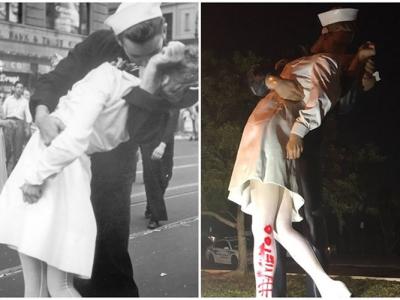 “胜利之吻”(左图)一幕被制成雕像(右图),却被人涂上“#...