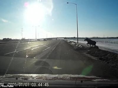 加拿大一头麋鹿结冰路上不慎失蹄 险些遭车辆撞上视频:加拿大...