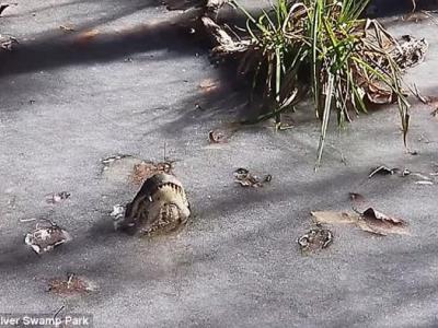 加拿大一头麋鹿结冰路上不慎失蹄 险些遭