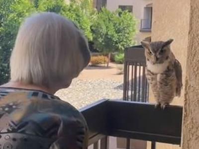 美国亚利桑那州凤凰城一只猫头鹰每天都会飞到一户人家的阳台找98岁老奶奶聊天(神秘...