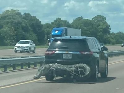 美国佛罗里达州际公路上有人将一只巨大的鳄鱼绑在汽车后保险杆上(神秘的地球uux.c...