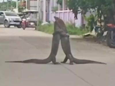 泰国马路中央2只巨蜥抢夺地盘紧紧抱着对方