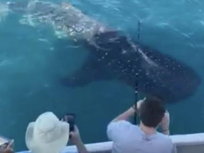 美国佛罗里达州皮尔斯堡渔船旁出现6米长鲸鲨视频:美国佛罗里...
