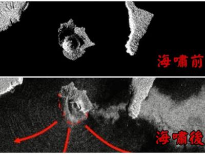 卫星图片显示火山西南面斜坡崩塌(下图)。网传火山在海啸后再...