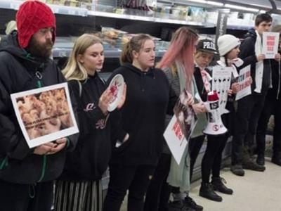 示威者拦在超市肉柜前。示威者手持标语及道具抗议。警员到场劝...