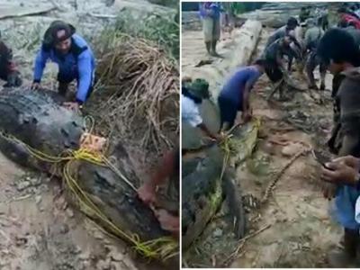 印尼北加里曼丹省男子到河岸捕虾惨遭巨大